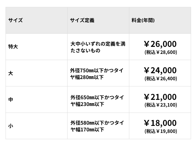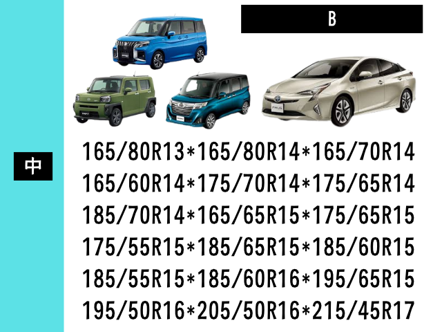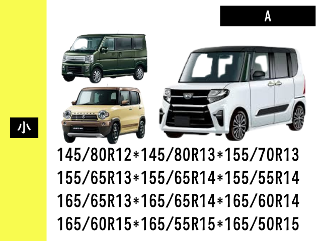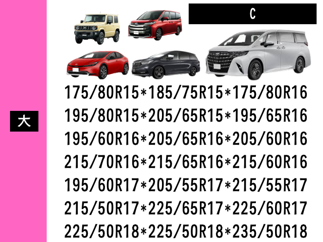 上記のサイズは一般的なサイズ一覧になります。上記外のタイヤサイズも